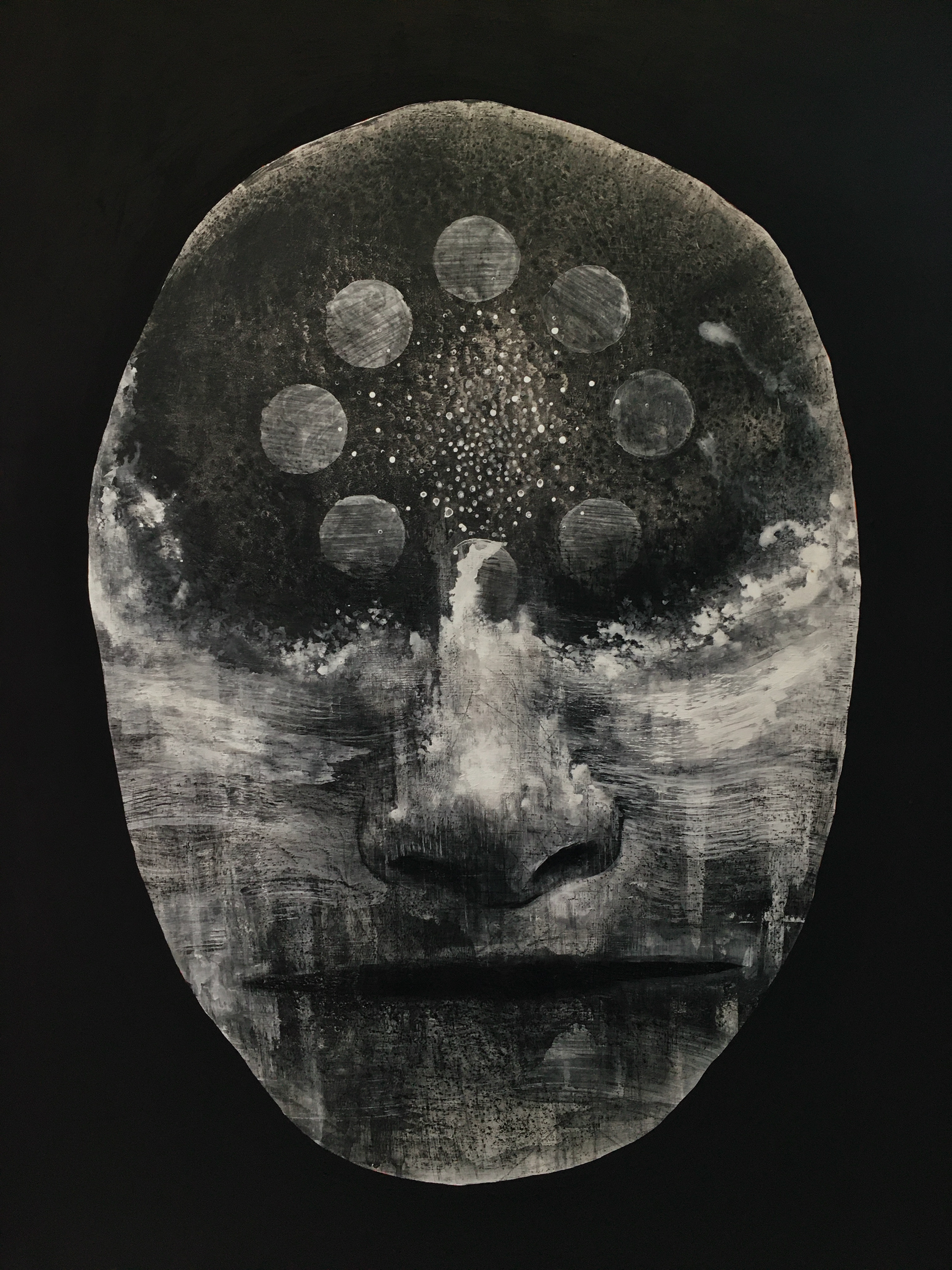 Spirit Head #30 (Oceans in the Void), 30x40, Mixed Media on Panel. 2019